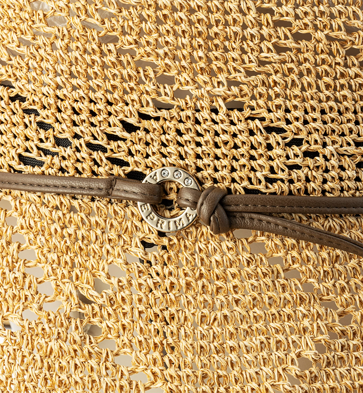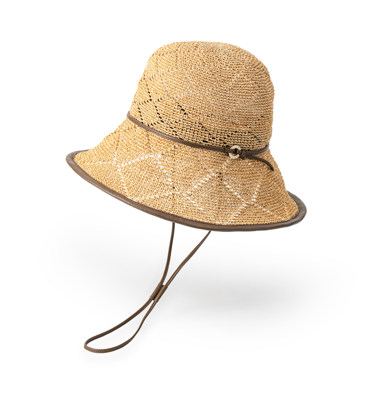 エコレザー使いがポイントの、ドローコード付き手編みクロッシェ。