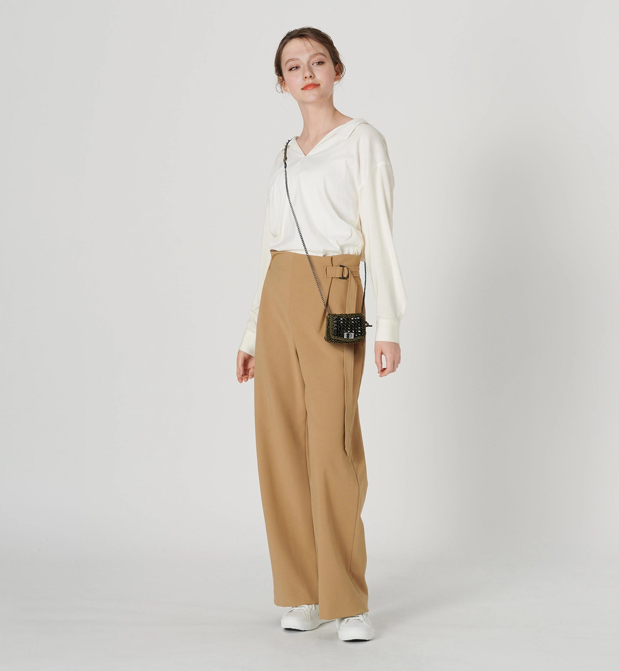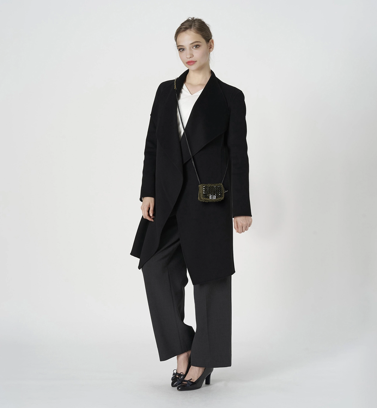 長さの違うチェーンが2本付いており、チェーンハンドルや斜めがけにアレンジ可能で、アクセサリー感覚でお持ちいただけます。