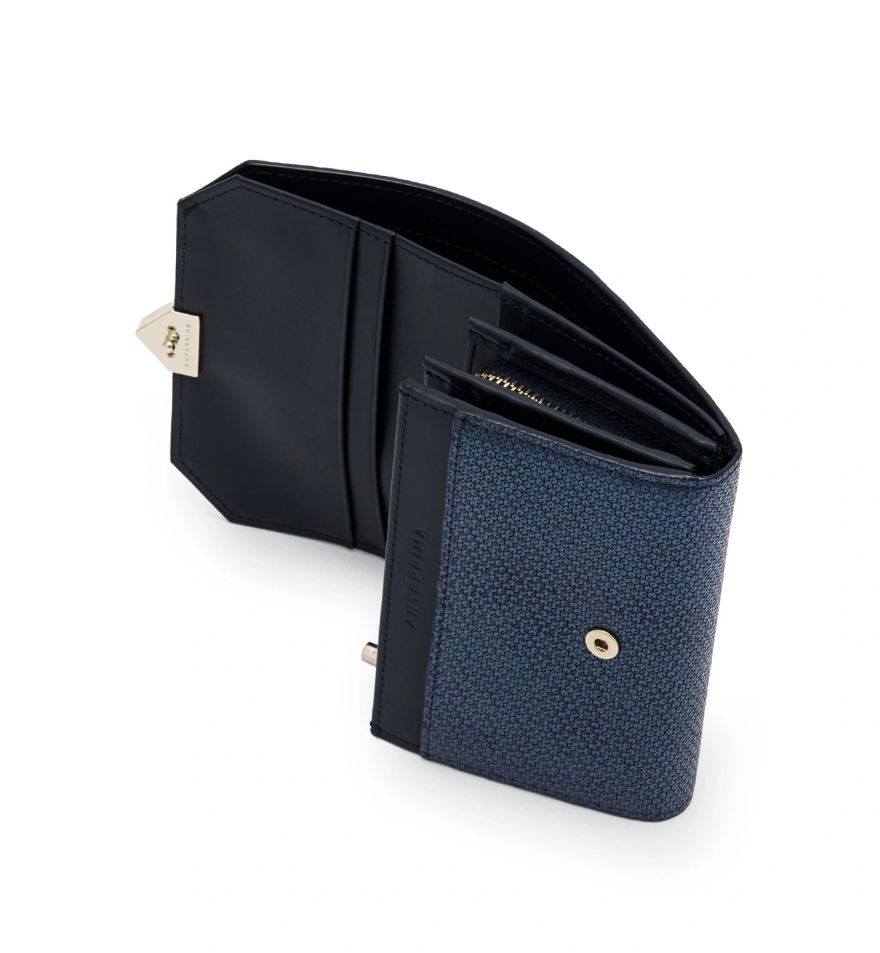 ANTEPRIMAの「A」を意識したシャープな印象のメタルモチーフにはクリスタルを連れて埋め込み、華やかさをプラスしています。