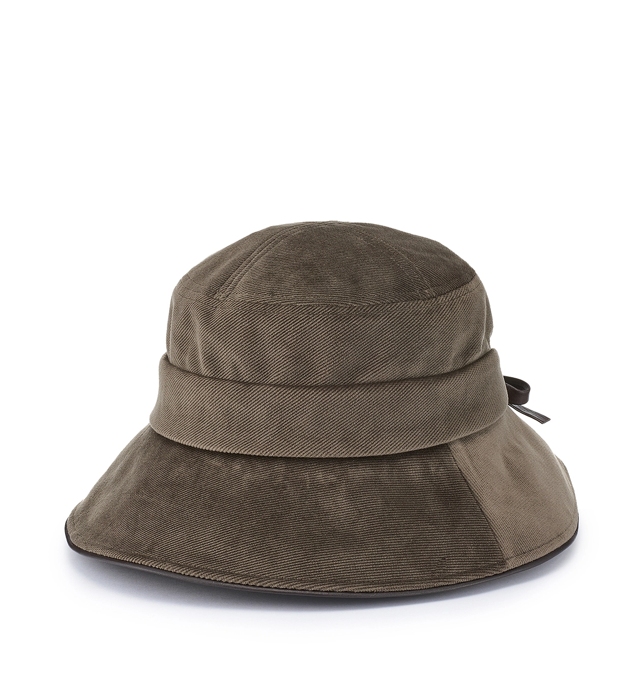 柔らかなベロア調素材とつば先のレザーアクセントが上品なクロッシェハット。