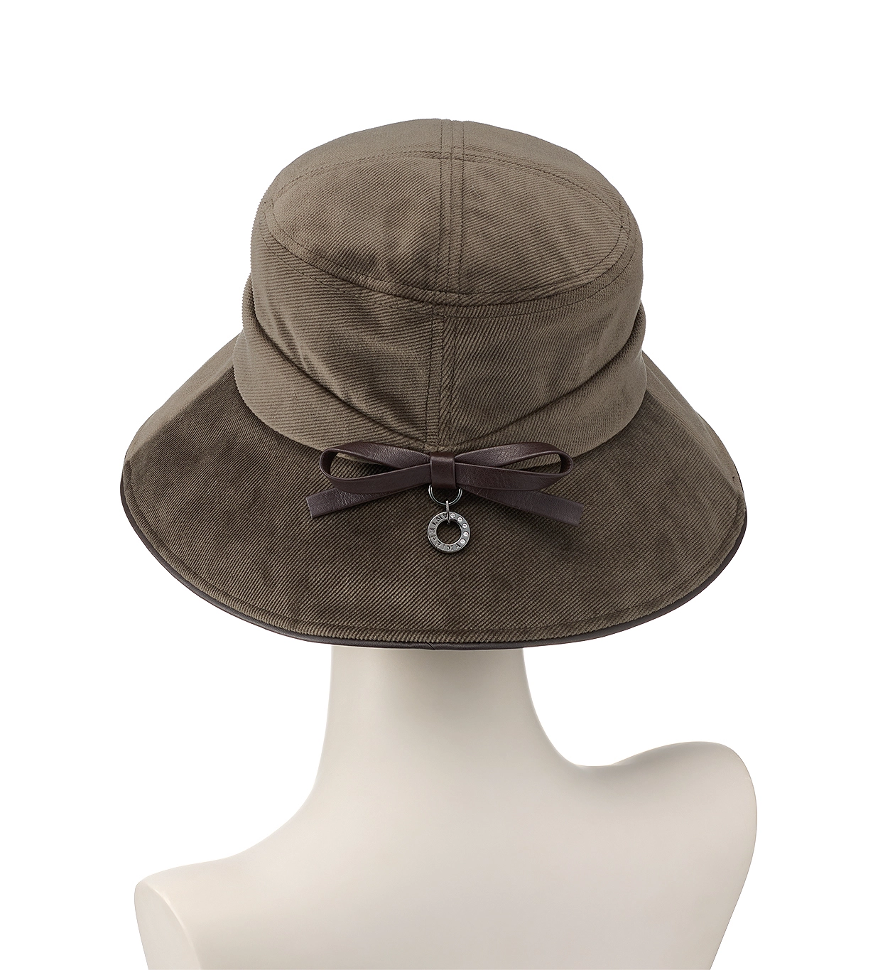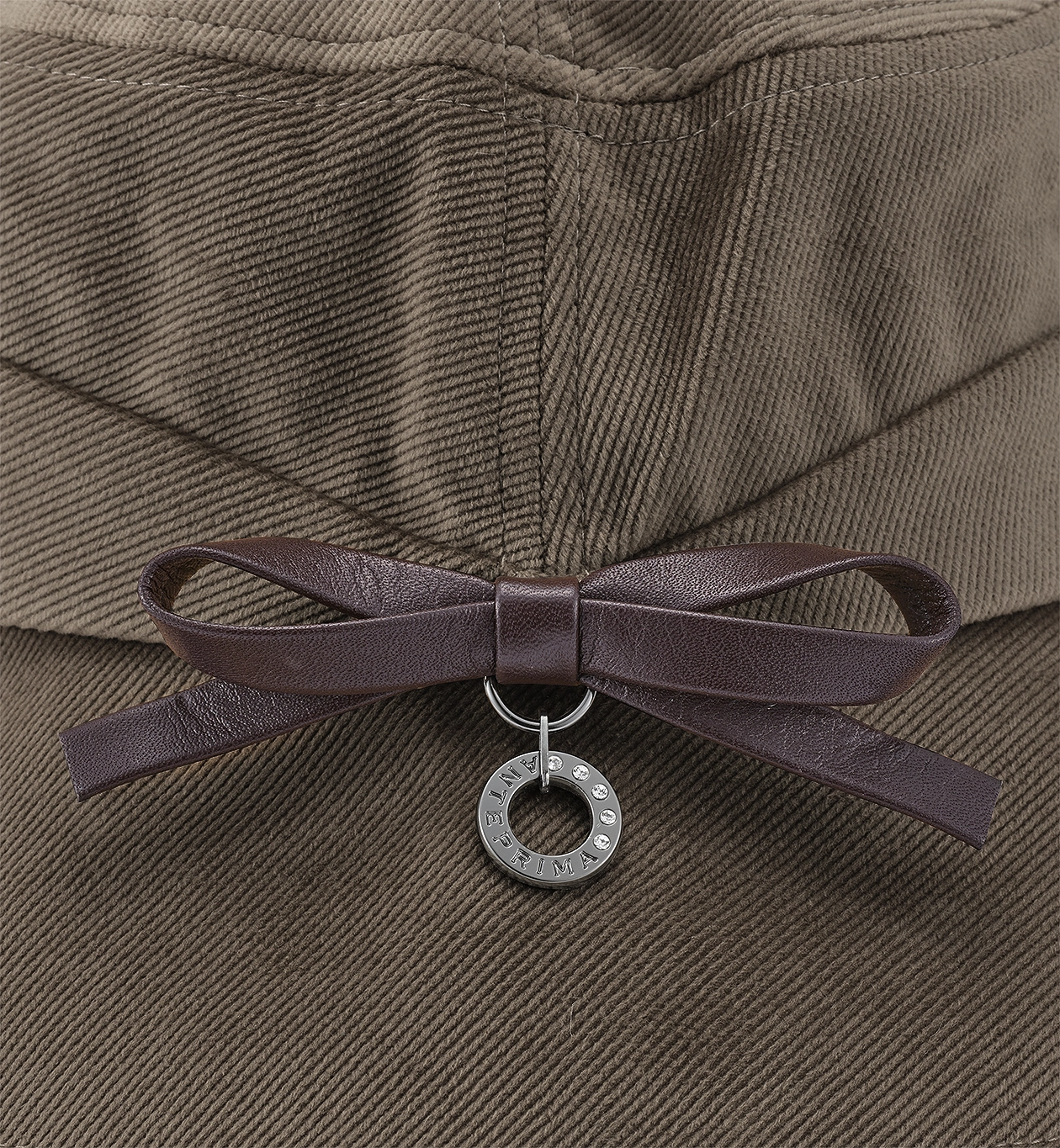 後ろのレザーリボンブローチと揺れるロゴリングが、甘さを抑えた洗練された可愛らしさをプラスします。