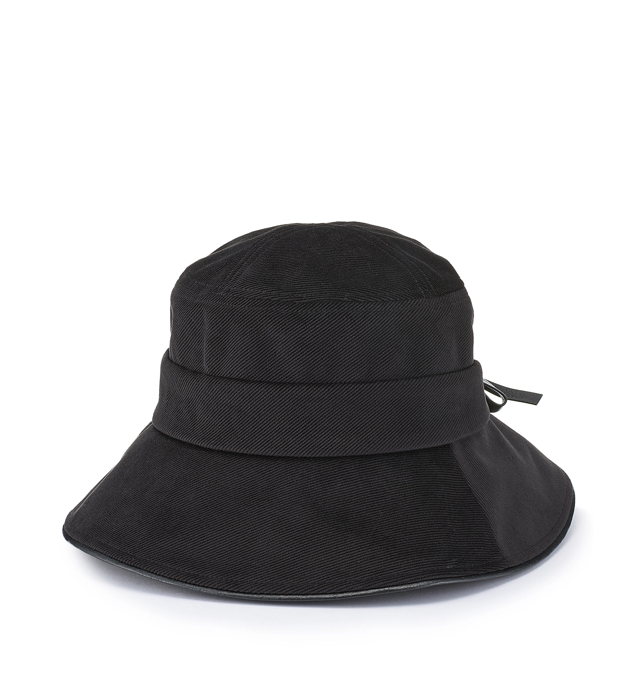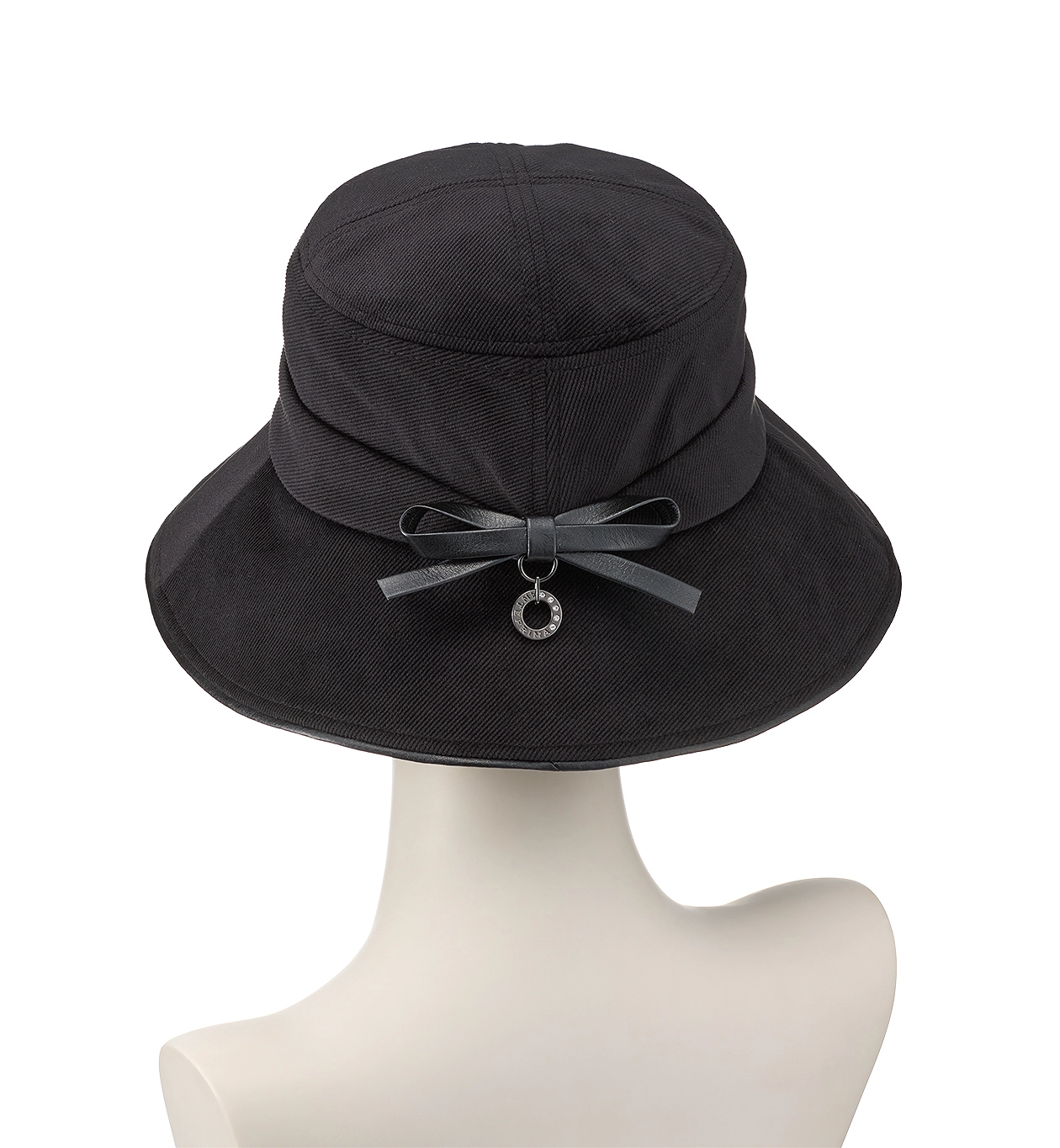 後ろのレザーリボンブローチと揺れるロゴリングが、甘さを抑えた洗練された可愛らしさをプラスします。