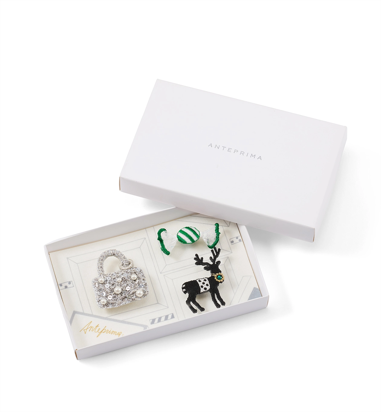 ブローチタイプのバッグアクセサリーで、バッグ・キャンディ・トナカイの3点セットです。