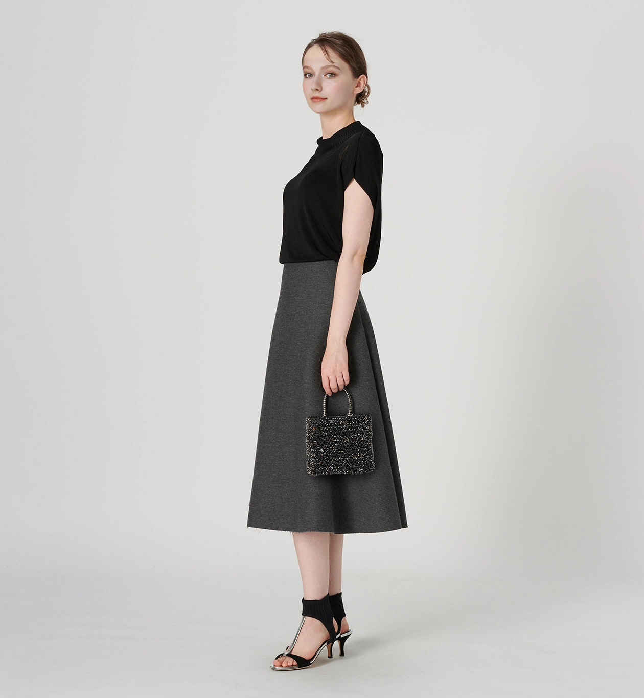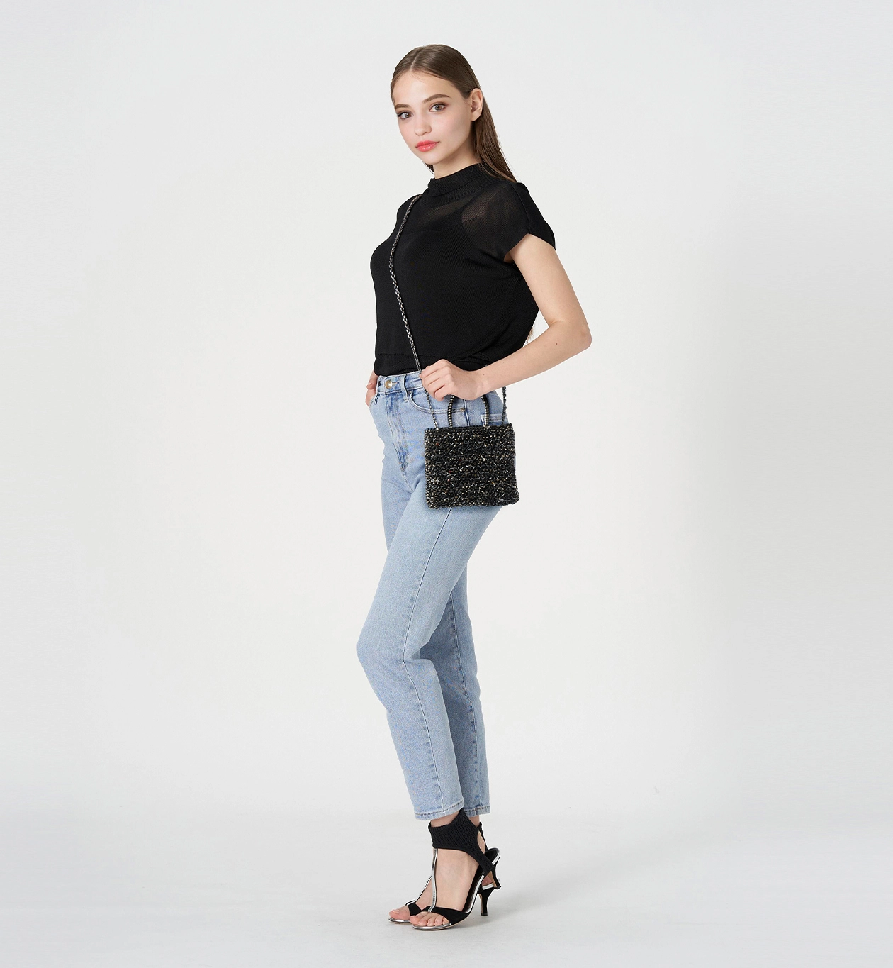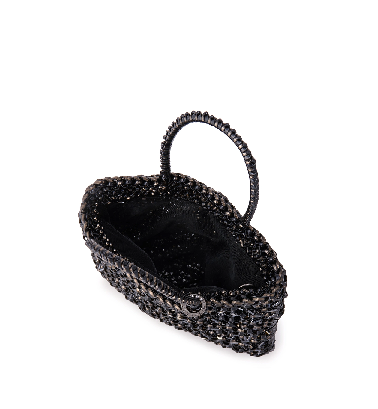 スパンコール、ビーズ、ワイヤーコード、それぞれ異なる光沢が重なり合い、角度によって豊かに変化する贅沢な輝きを楽しめるバッグです。
