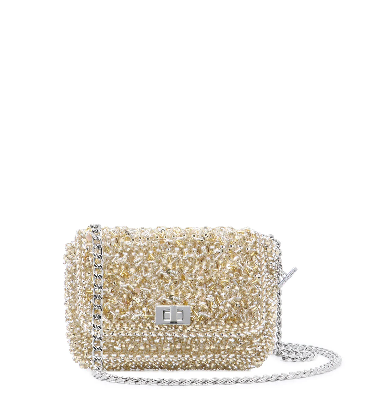 スパンコール、ビーズ、ワイヤーコード、それぞれ異なる光沢が重なり合い、角度によって豊かに変化する贅沢な輝きを楽しめるバッグです。