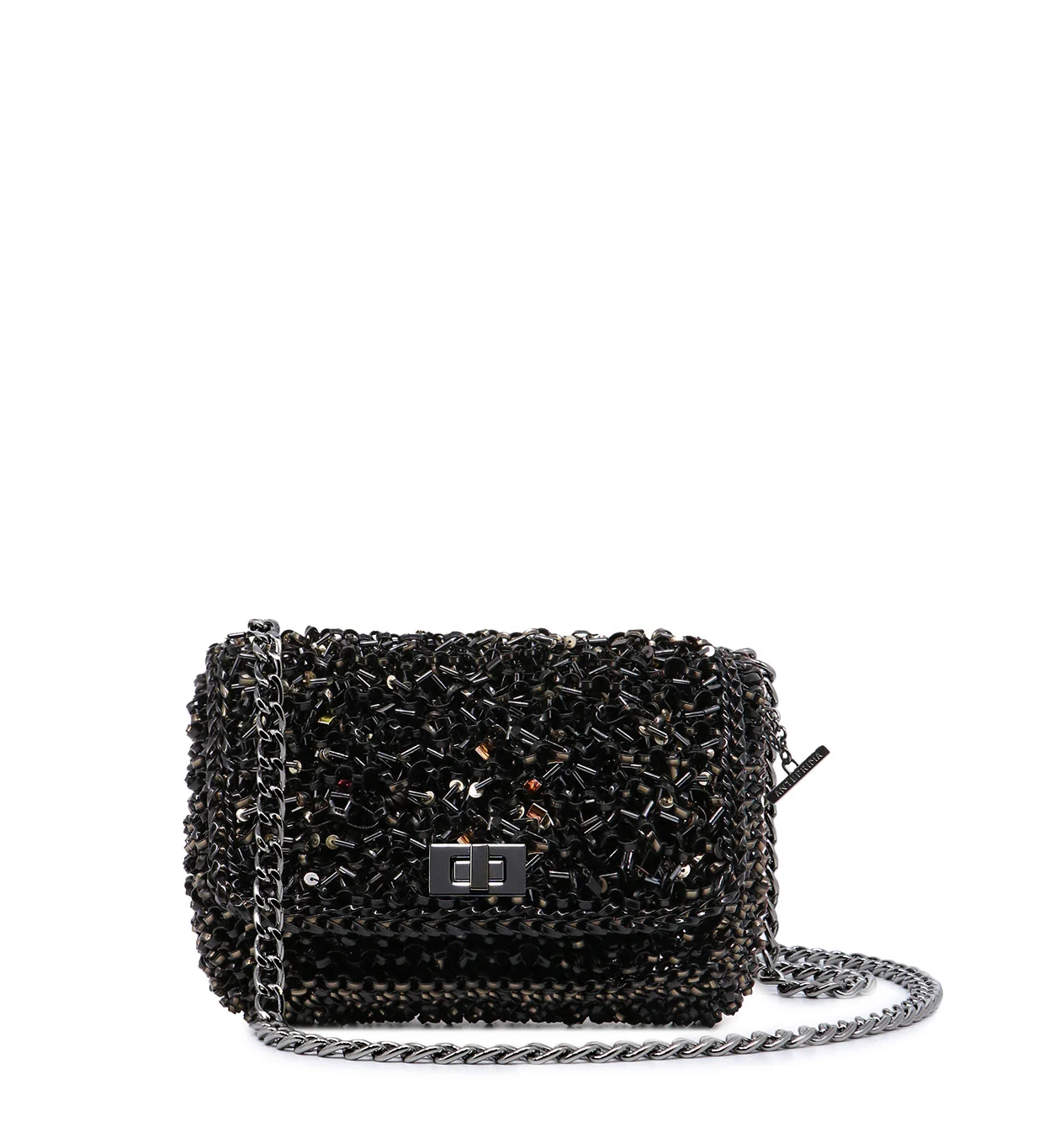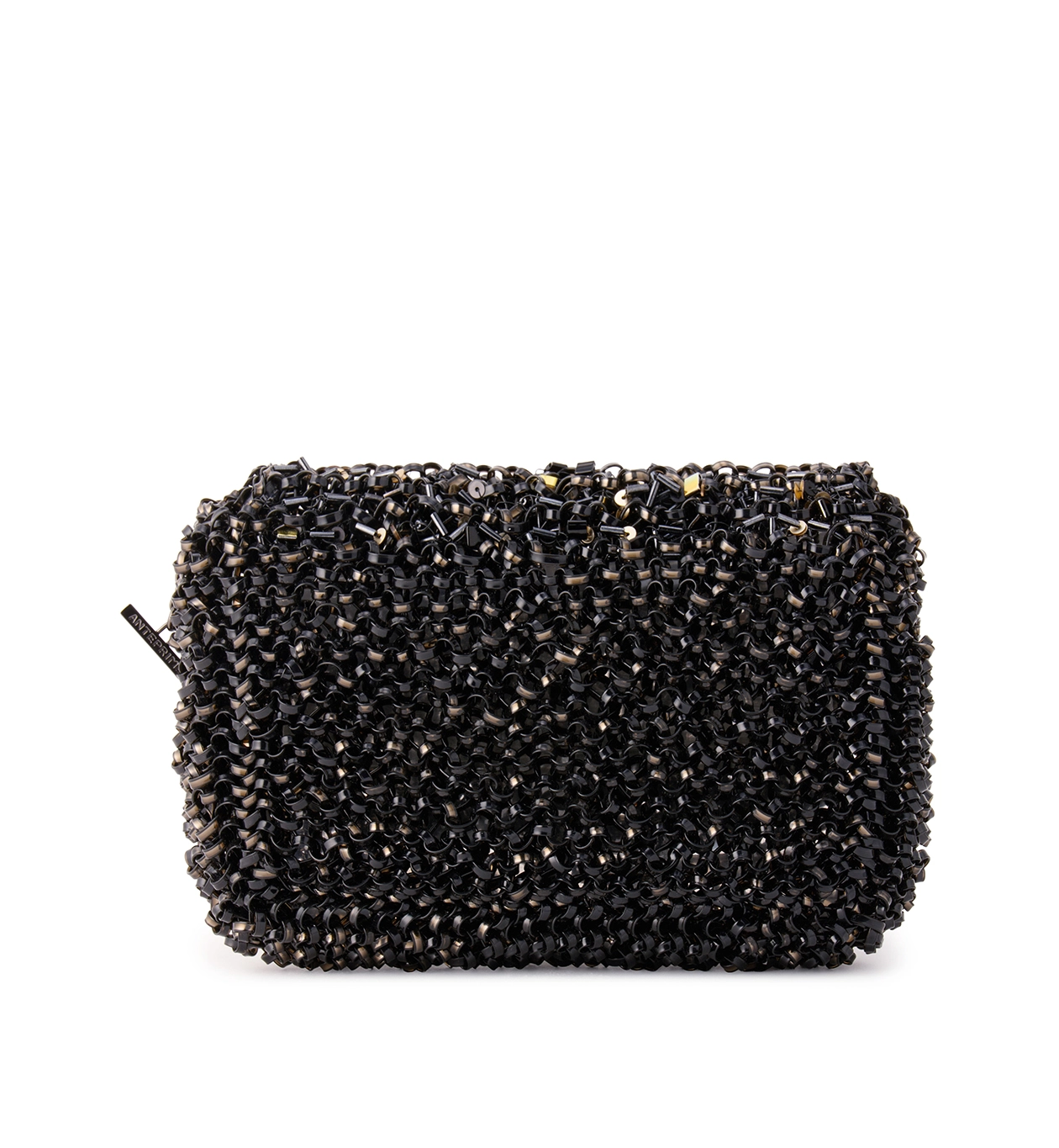 スパンコール、ビーズ、ワイヤーコード、それぞれ異なる光沢が重なり合い、角度によって豊かに変化する贅沢な輝きを楽しめるバッグです。