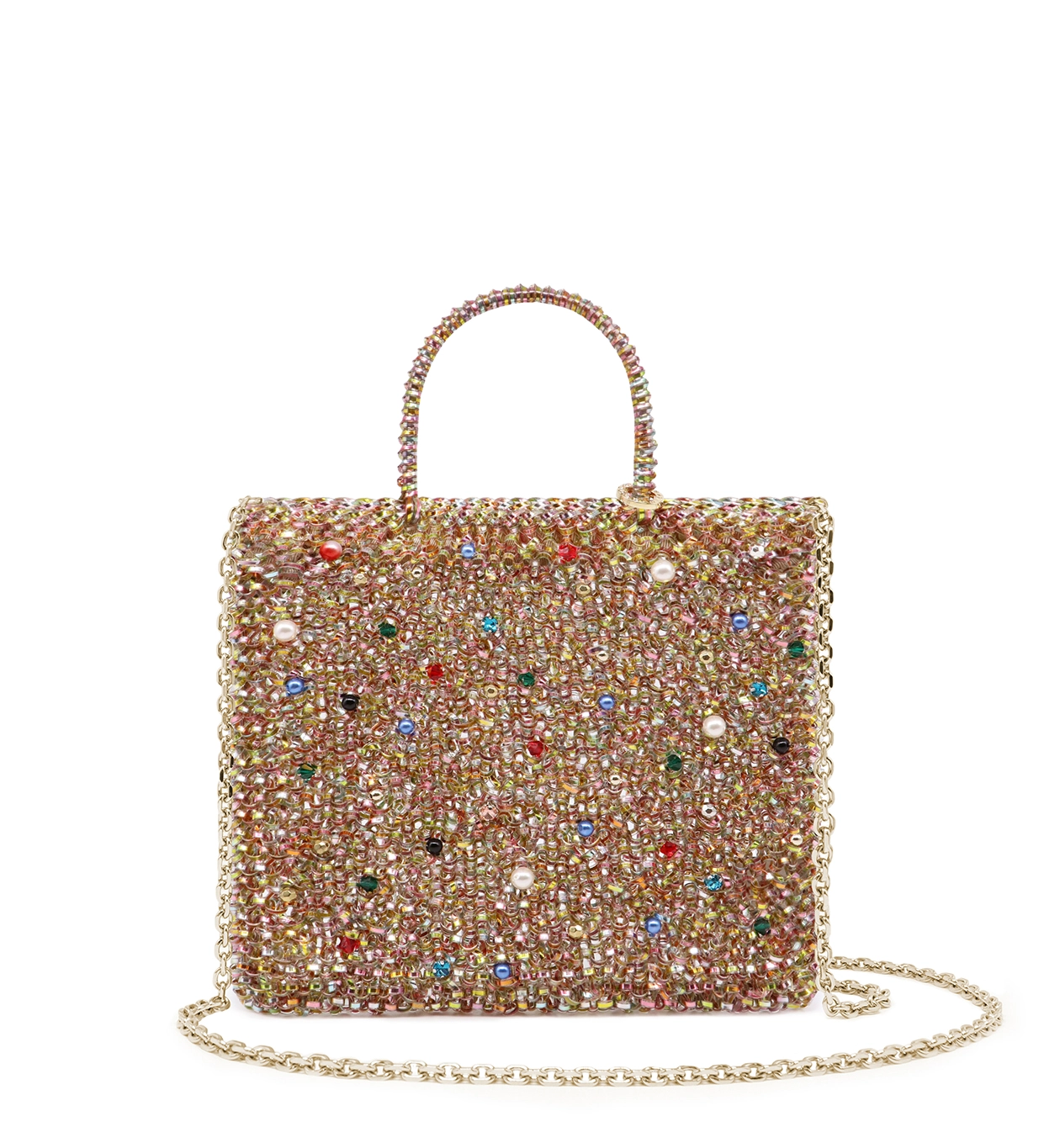 色とりどりのビーズとパールをランダムに配置した、プレイフルな魅力あふれるGEMME(ジェンメ)。まるで宝石(GEMME)を散りばめたような華やかさで、コーディネートの主役になるバッグです。